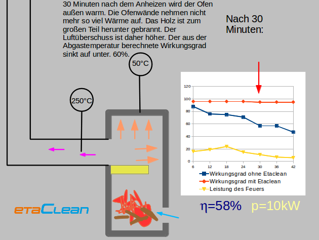 Eine hohe Energieeffizienz bei Heizungen ist nur durch eine möglichst niedrige Abgastemperatur erreichbar - so geht nur ein geringer Anteil der Energie ungenutzt verloren. Durch den Einsatz von Brennwerttechnik ist hier bei Gaskesseln und inzwischen auch bei Ölkesseln ein hoher Standard erreicht. Bei Holzheizungen sieht es anders aus: hier ist bisher nur bei wenigen Pelletkesseln Brennwerttechnik und die damit hohe Effizienz möglich. Bei anderen Holzkesseln und Öfen besteht das Problem, dass die Oberfläche eines für diese Technik nötigen Hochleistungswärmetauschers zu schnell von Ablagerungen belegt wird. Damit ist nicht nur ein Leistungsverlust verbunden, sondern auch die Gefahr eines Verstopfens und in der Folge unkontrollierte Verbrennungsbedingungen und Gefahren. Mit den etaClean-System sind diese Probleme lösbar.