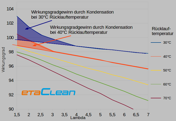 Die Rücklauftemperatur eines Heizungssystems spielt eine entscheidende Rolle für die Effizienz. Je geringer diese Temperatur ist, je mehr kann Abgas abgekühlt werden und damit die verbleibenden Abgasverluste reduziert werden. Wenn dabei der Taupunkt des Abgases unterschritten wird kann auch noch ein Teil der Kondensationswärme genutzt werden. Dies ist besonders bei Gaskesseln möglich, da der Taupunkt von Abgas aus Erdgasverbrennung relativ bei hoch bei 55°C liegt. Eine Rücklauftemperatur unter 55°C kann mit fast jeder Heizung erreicht werden. Allerdings gewinnt man nur dann einen wesentlichen Teil der Kondensationswärme, wenn der Taupunkt deutlich unterschritten wird. Daher sind Fußbodenheizungen und Wandheizungen besser hierfür geeignet, es lässt sich eine Rücklauftemperatur von < 25°C erreichen.